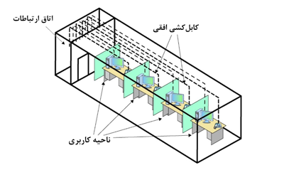 تمام کابلها به صورت افقی (برای اغلب بخشها) از اتاق ارتباطات به کامپیوترها میرسند. این کابل کشی با نام کابل کشی افقی (Horizontal Cabling) شناخته میشود. یک قطعه کوچک از کابل افقی یک ران (Run) نامیده میشود. در انتهای دیگر کابل (یعنی انتهای متفاوت از اتاق ارتباطات) ناحیه کاری (Work Area) قرار دارد. این ناحیه اغلب یک دفتر یا یک مکعب است که میتواند حاوی یک یا چند کامپیوتر و تلفن باشد.