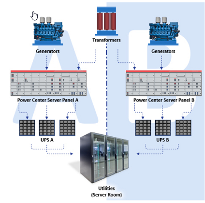 دستگاههای تامین کننده برق اضطراری UPS با توجه به گران بودن و عدم کارایی مناسب برای برقدهی طولانی مدت مناسب نبوده و استفاده از ژنراتور در دستور کار قرار میگیرد. نحوه کار بدین صورت است که در هنگام قطع برق اتاق سرور و برای جلوگیری از اختلال در سیستم برقدهی آن در طول زمان به کار افتادن ژنراتور، UPS بهطور آنی وارد مدار شده و برق اتاق سرور را تامین میکند. به محض آماده شدن ژنراتور جهت برقدهی، UPS از مدار خارج شده و برق اتاق سرور از ژنراتور تامین میشود.
