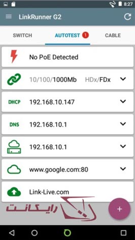 تب تست و آزمایش خودکار (AutoTest)، به صورت اتوماتیک همه تستهای لازم را انجام میدهد که عبارتند از: PoE، سرعت و دوبلکس، DHCP، DNS، پینگ و geteway یا TCP. همچنین شما توانایی تصویر برداری و گذاشتن متون را نیز، خواهید داشت. تمام نتایج حاصل شده از آزمایشات و تمامی رسانهها، توسط ایمیل به صورت خودکار برای شما ارسال میشوند و در اکانت Link-Live که ساختهاید، آپلود خواهند شد و هر موقع که به این اطلاعات نیاز داشته باشید به آنها دسترسی خواهید داشت. با اینکه آپلود اتوماتیک روش راحتی برای دریافت نتایج است! اما اگر شما نمیخواهید سیل ایمیلها و آپدیتهای نتیجهی تستها را داشته باشید، میتوانید این قابلیت را به آسانی غیرفعال کنید.