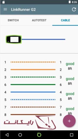 در تب کابلها، شما میتوانید آنها را از چند طریق و روش متفاوت مورد تست و بررسی قرار دهید. میتوانید با اتصال یک کابل باز، طول آن را اندازه گیری کنید و باز بودن، کوتاهی و وجود هر گونه قطعی در کابل را ببینید. همچنین شما میتوانید با اتصال پچ کابل با استفاده از پورت بالایی RJ-45 به پورت کناری یا جانبی RJ-45 هر گونه مشکلی را ارزیابی کرده و از طول کابلها و نقشهی سیم کشی آنها با خبر شوید.